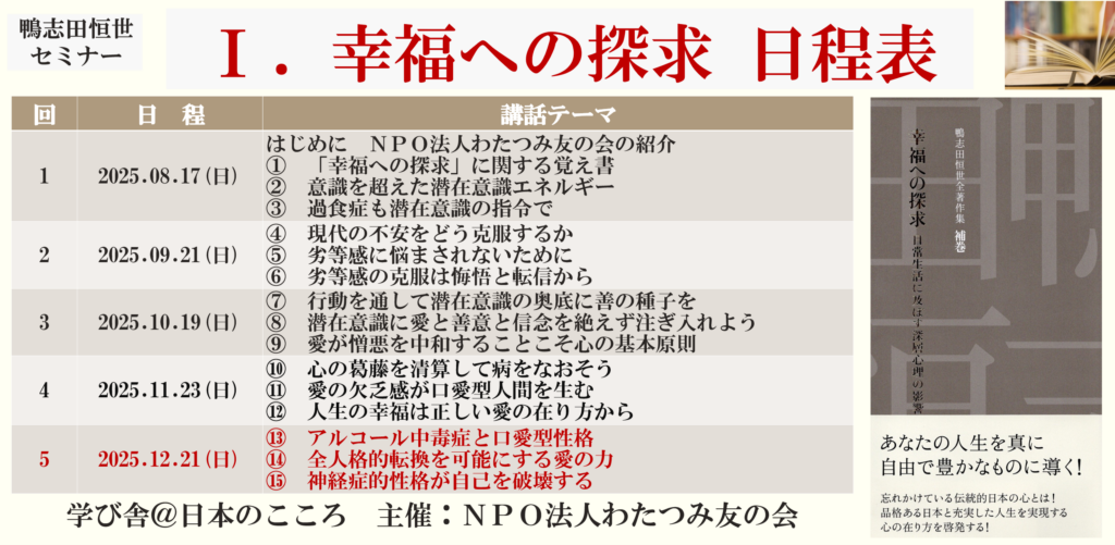 わたつみ友の会の会長であられた医学博士 鴨志田恒世先生は、創立当初から、大変な憂いと鴻大な慈愛の心を以て、生命の在り様と人間の本来の生き方、心の自然法則、本来の日本人の生き方の中に、普遍的人間の生き方と心の在り方が有る事の真実を示され、私達の祖先が風雪に耐え守り育ててきた、日本人の心の中核を貫いて燦然と輝く生え抜きの伝統的精神が連綿として伝えられている事を、そこに日本人の考え方と行動の源泉がある事をご教授されて参りました。